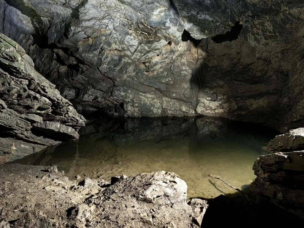 53035. Voda se je iz Vodnega rova prelivala pod skalami po tem prehodu prelivala v jezero na dnu Vhodne dvorane v jami; 6.35 mm, f 1.4, 3 sekunde, ISO 100, nočni program, posnetek iz roke.