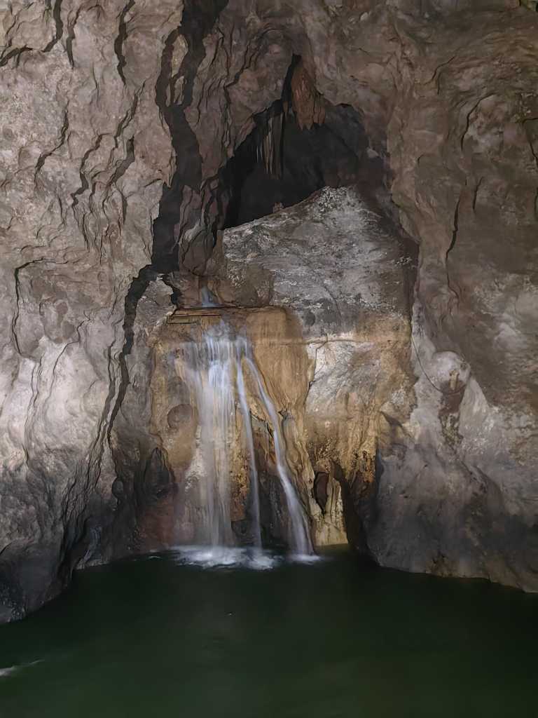 53148. После сильного и продолжительного дождя пещера промокла сильнее, чем когда-либо видел автор. Вместо отдельных капель из камина над Соточьем (Слиянием) хлынул большой ливень, создавший редко встречающуюся версию Вида на водопад реки Рак со смотровой площадки. К сожалению, использовать Ночной режим камеры не удалось, так как всю высоту струи воды приходилось освещать с помощью рисования светом.