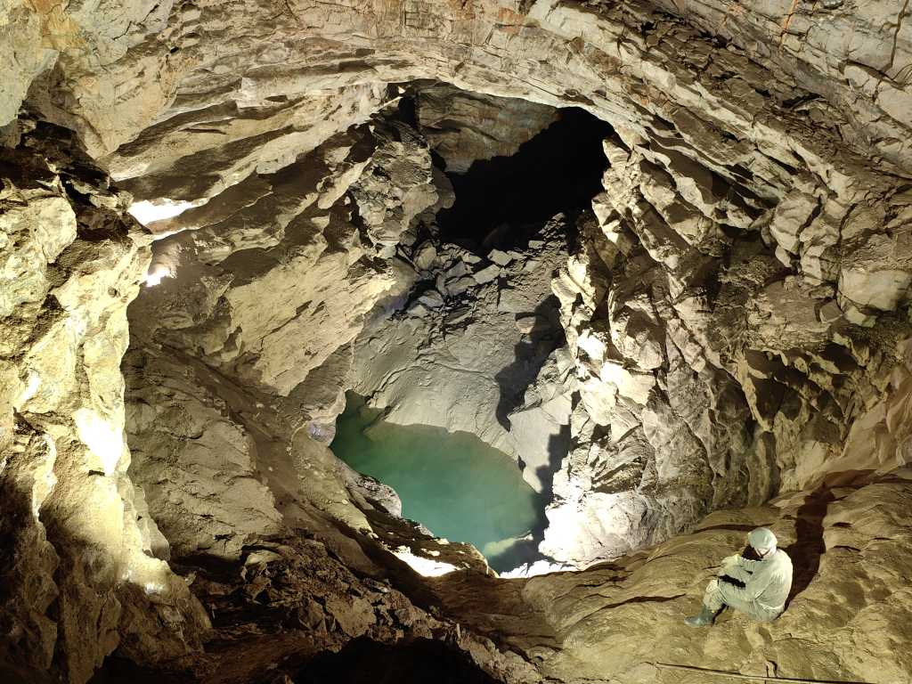 У автора спелеокостюм и чехол для шлема, сделан в Лениной компании по производству защитного и спелеологического оборудования Cuesta speleo из Харькова, Украина. Слово cuesta здесь в смысле горной вершины, которая имеет крутой склон с одной стороны и пологий с другой. В отличие от «сверхмощных» спелеологических костюмов из жесткой ткани кордура желтого и фиолетового цвета компании Cuesta speleo этот спелеокостюм изготовлен из прочного хлопка армейского зеленого цвета, так что человек на фотографии максимально сливается с окружающей средой в пещере. По мнению автора, человек, являющийся лишь посетителем пещеры, не должен быть объектом основного внимания на картине, а присутствует там лишь для масштаба. Костюм пропускает воздух, хлопок отводит влагу от тела, ткань также намного удобнее. Как и более серьезные костюмы, и этот имеет внутренний карман для размещения наколенников толщиной менее сантиметра, но все же достаточной (см. на фото колено левой ноги). Цены на оборудование из Харькова доступные - для дополнительных информаций пишите на cuesta.speleo@gmail.com (тел. +38 0502086694). Сайт на английском языке еще в разработке. Освещение фото: светодиодный отражатель мощностью 10 Вт на палке слева и еще один, висящий на веревке над водой - его держит камень на скале внизу центра фото.