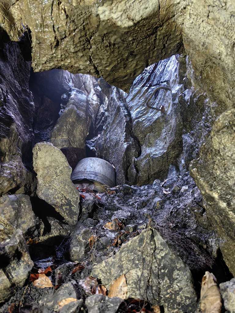View from the bottom of the cave up the excavated pit, August 3, 2023