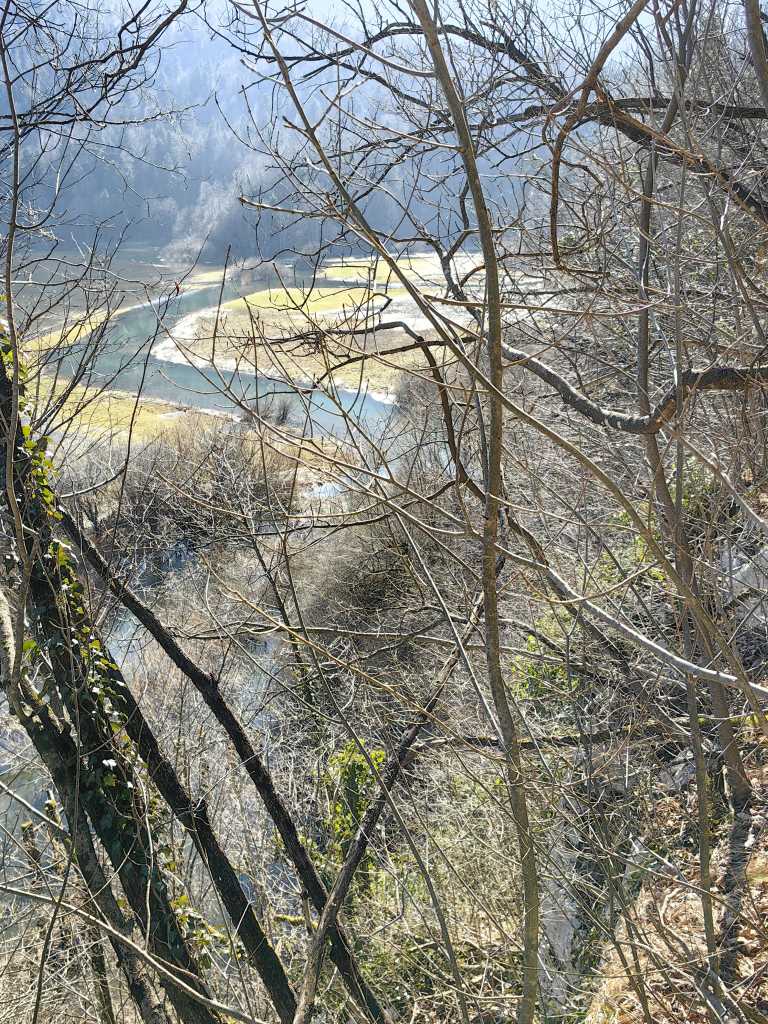 54891. Pogled z vrha stene nad jamo proti jugu, na meandre potoka, nad sredino slike, vodoravno, teče potok tudi v Malo Karlovico.