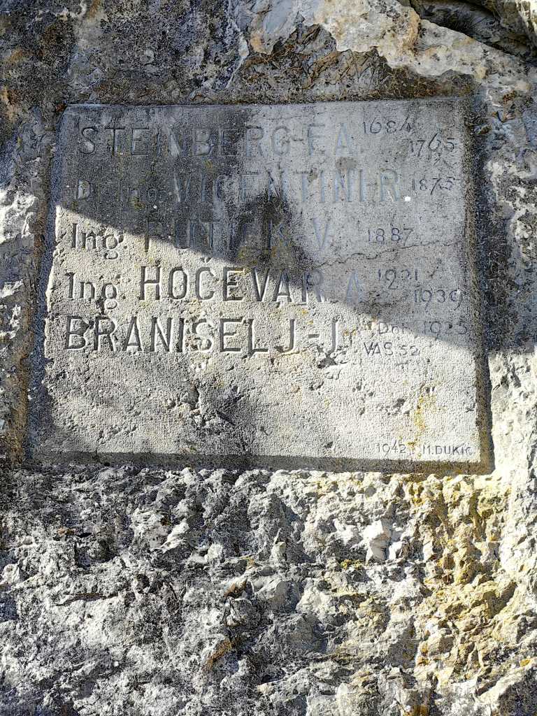 54893. Plošča še od blizu: Steinberg F(ranc) A(nton) 1684-1765 / Dr. Ing. Vicentini R(afael) 1875 / Ing. Putick V(iljem) 1889 / Ing. Hočevar A(lojz) 1921 1939 / Braniselj J(ože) Dol(enja) vas 52, 1925 / (kamnosek, avtor napisa, desno spodaj) 1942 M(ilan) Dukič.