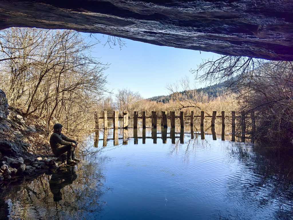 54896. Pogled z jezu v vhodu jame proti vzhodu, na lesene grablje v strugi
