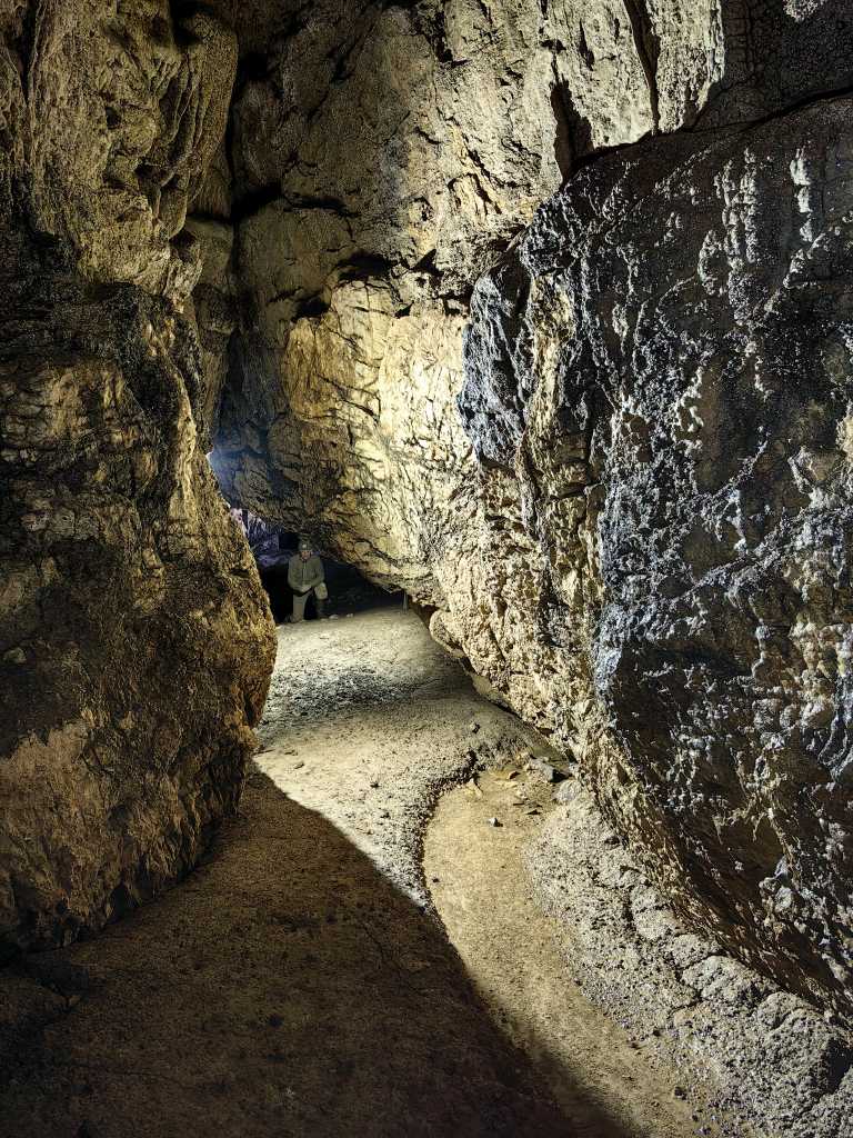 54902. Pogled nazaj po rovu, ki vodi iz vhoda v jamo proti Mali Karlovici. Levo ob avtorju je še odsev dnevne svetlobe. Kot na prejšnji ekskurzijo v veliko jamo Matarskega podolja sta bila na preizkušnji oba rdeča reflektorčka. Tudi tokrat sta se zelo obnesla in večina notranjih posnetkov je bila narejena s tema svetilkama, dopolnjenima z majhno LED lučko za osvetlitev ospredja.
