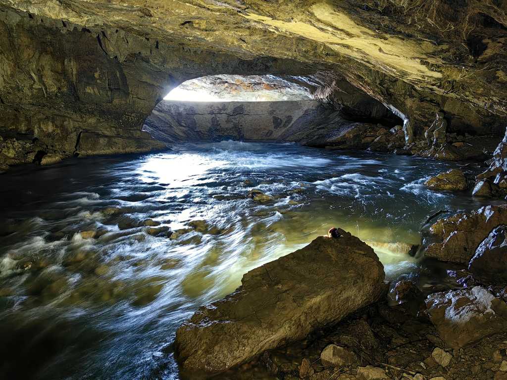 54906. Pogled nazaj proti vhodu v jamo, prek struge potoka. Osvetlitev: dnevna svetloba, rdeča lučka na vrhu kamna v ospredju, še ena zelo majhna lučka za osvetlitev tega kamna.