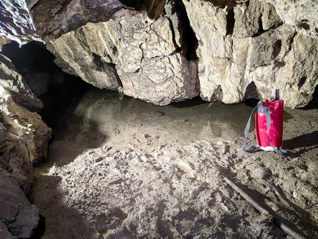 54907. Tudi za rov iz vhoda v jamo do Male Skednence je bila voda še previsoka. Transportna vreča je visoka 40 cm.