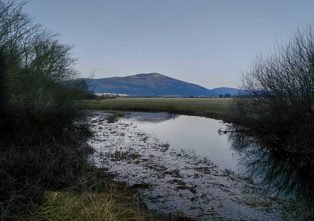 54918. Pogled prek struge in ravnine proti Slivnici, ko se je dan že prevesil v noč