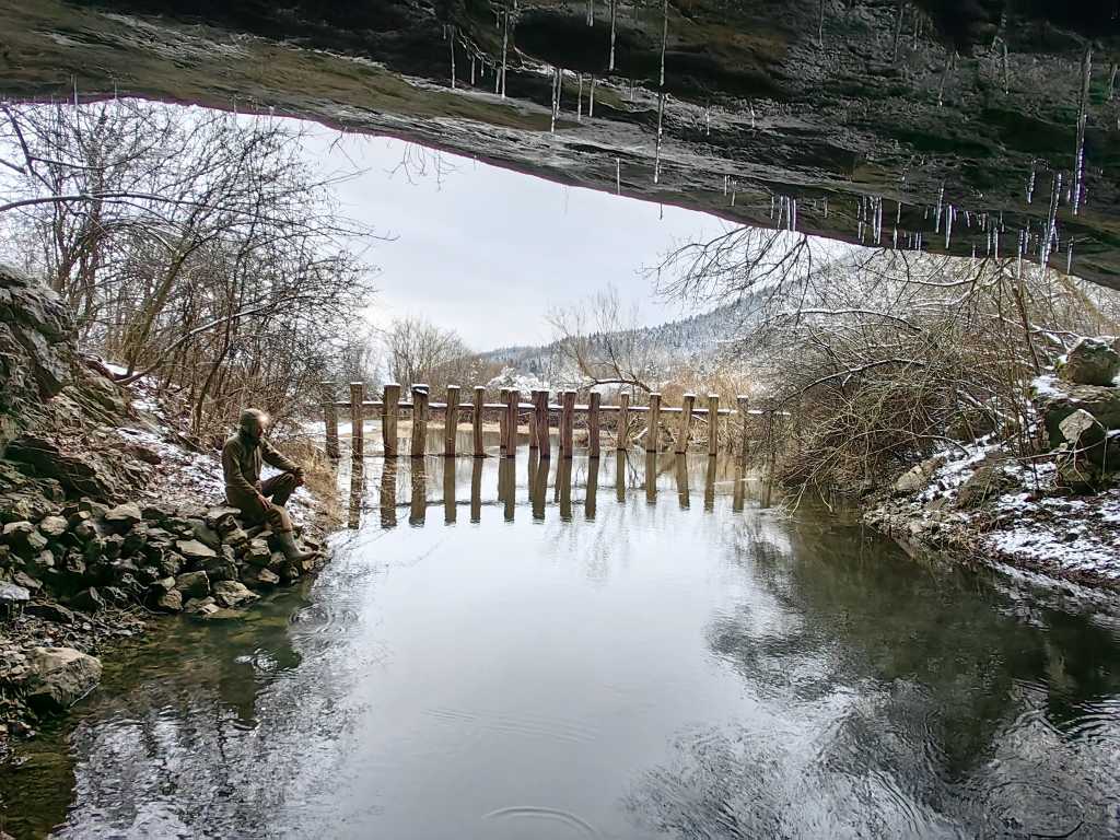 54938. Water level at the opening in the dam at the entrance to the cave. Compared to ten days ago, the water level is lower by about 40 cm.
