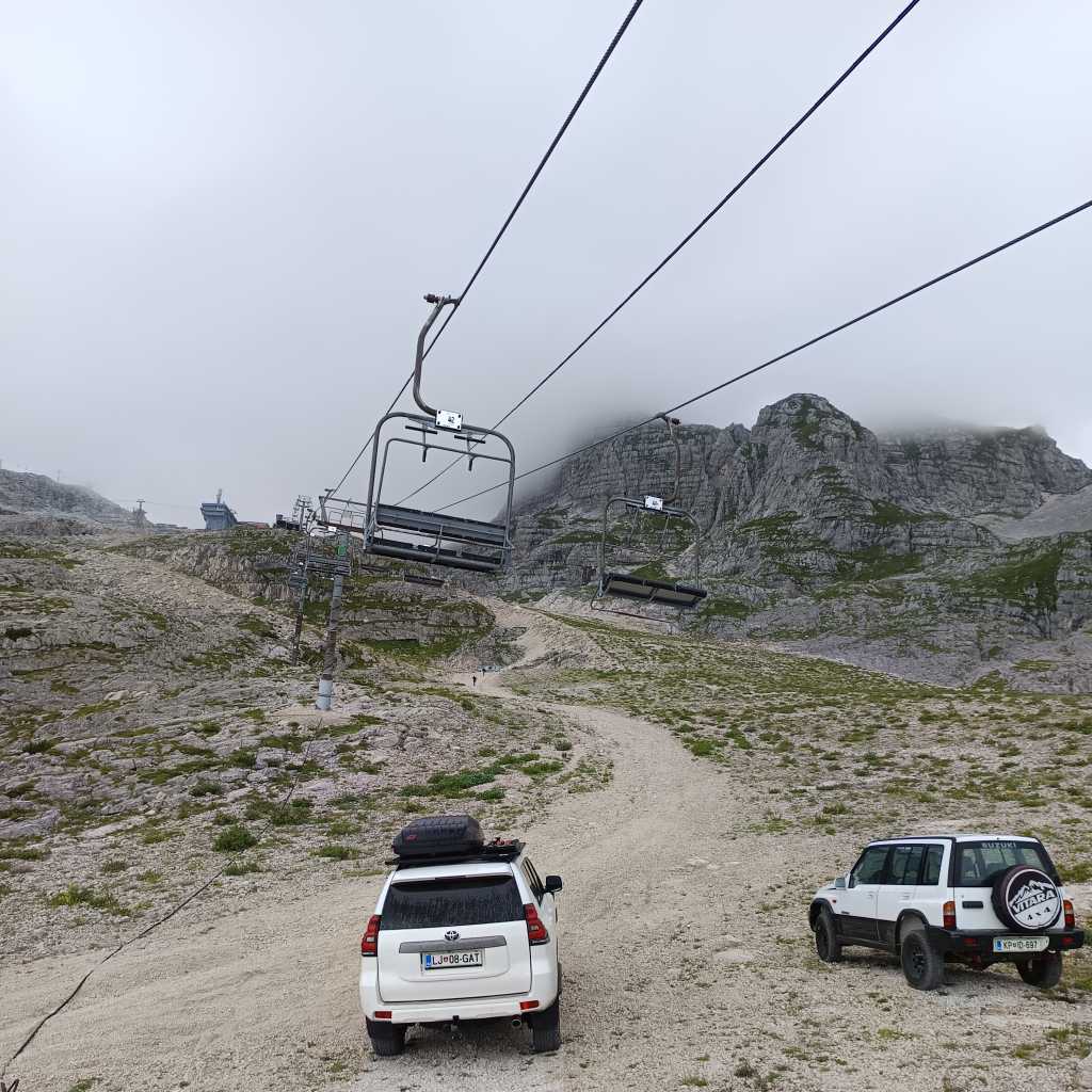 VL60. Džipa, ki sta opremo in jamarje pripeljala do C postaje. V ozadju je D postaja (2202 m)