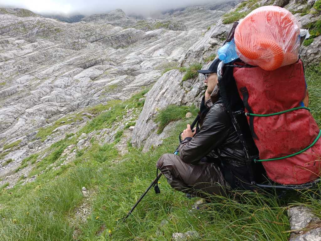 VL61. Počitek v dežju - Łukasz. Cev na vrhu nahrbtnika je namenjena praznjenju polsifona Rasputica v Huevosu.