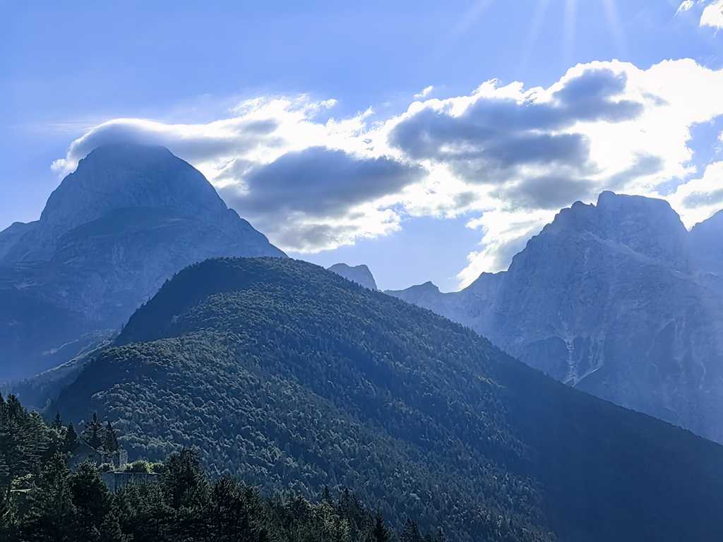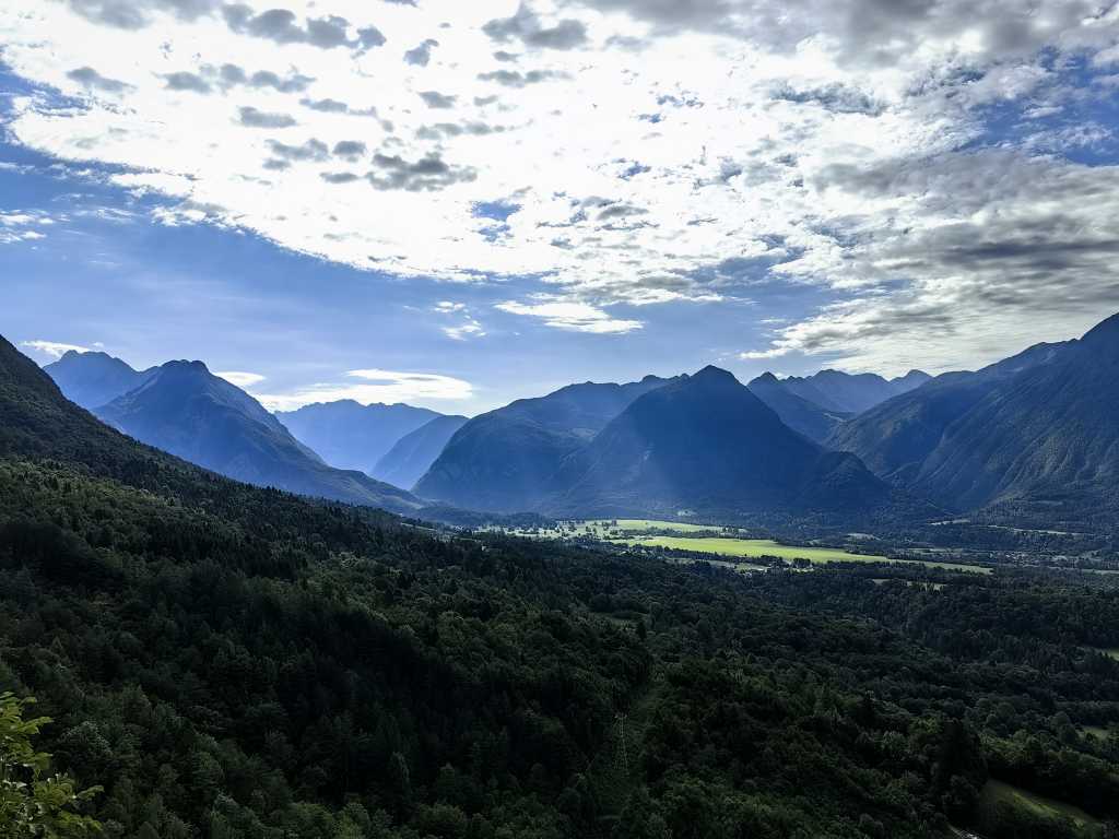 55818. Jutranji pogled na Bovško kotlino in hribe za njo z B postaje žičnice Bovec - Kanin, kjer so se zbrali ukrajinski jamarji.