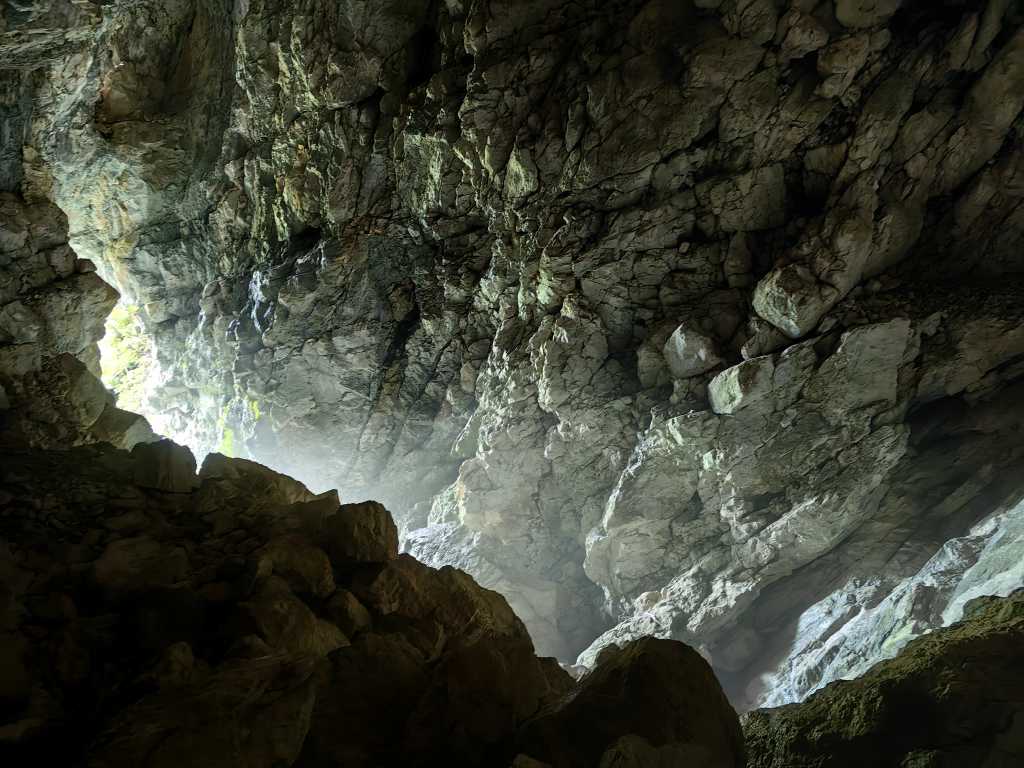 55849. Bližnji pogled iz jame na vhod. Nad avtorjevo roko je viden konec ferate.