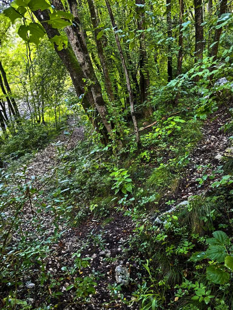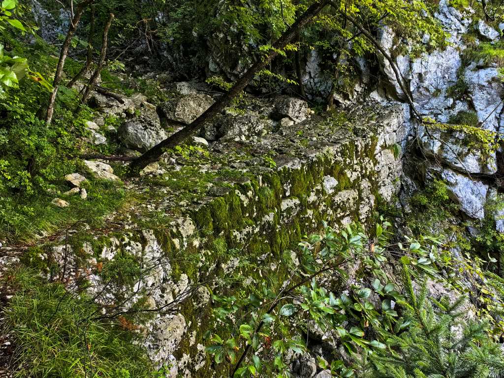 55867. Kmalu se pot spusti do kamnite pregrade na hudourniški strugi.