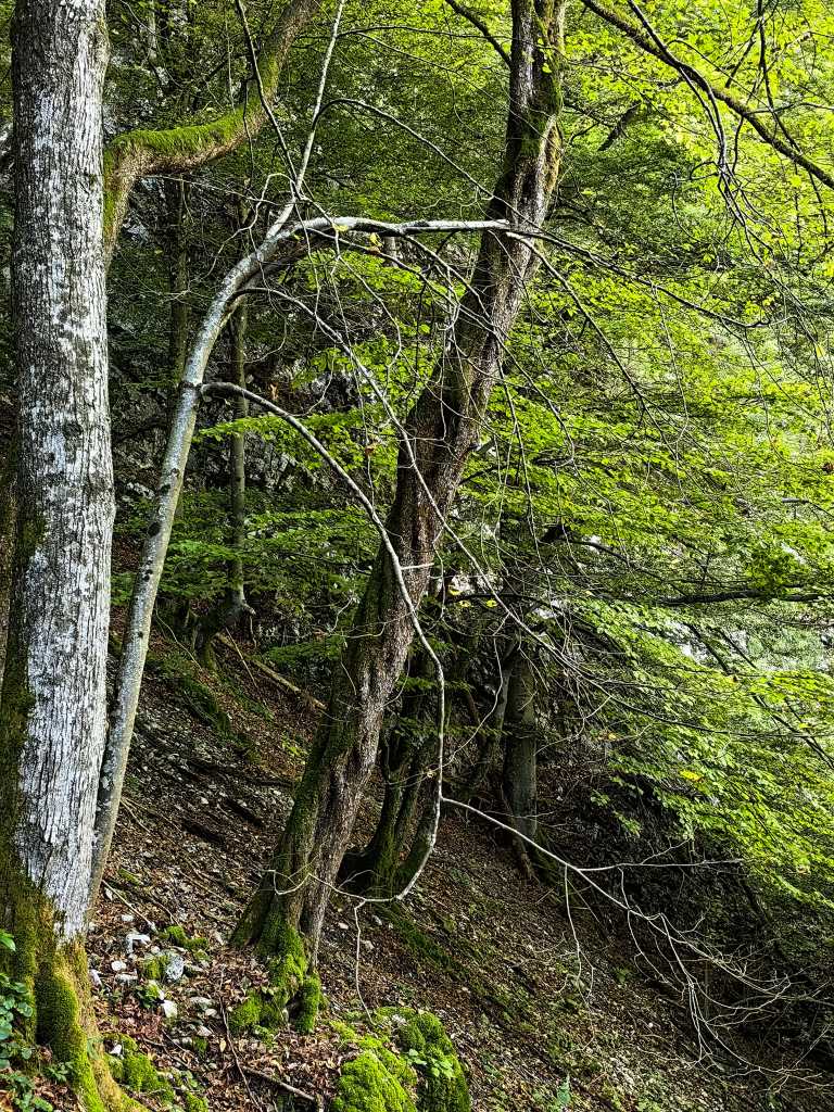 56099. Лиственное дерево с красиво переплетённым стволом, вдоль обходной тропинки