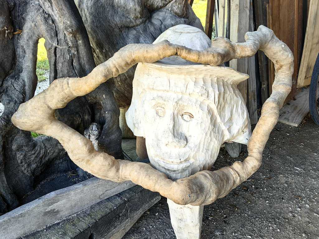 56137. Портрет Мартина Крпана, национального героя Словении, выполненный из липы Иваном Найгером, обрамлённый обработанным еловым пнём.