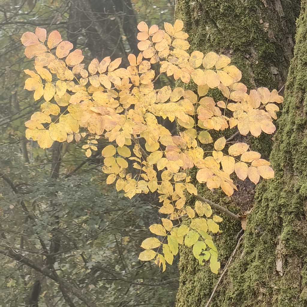 56158. Листья на ветке липы, самой нижней на главном стволе, имеют оттенки от тускло-зелёного до розовато-песочного