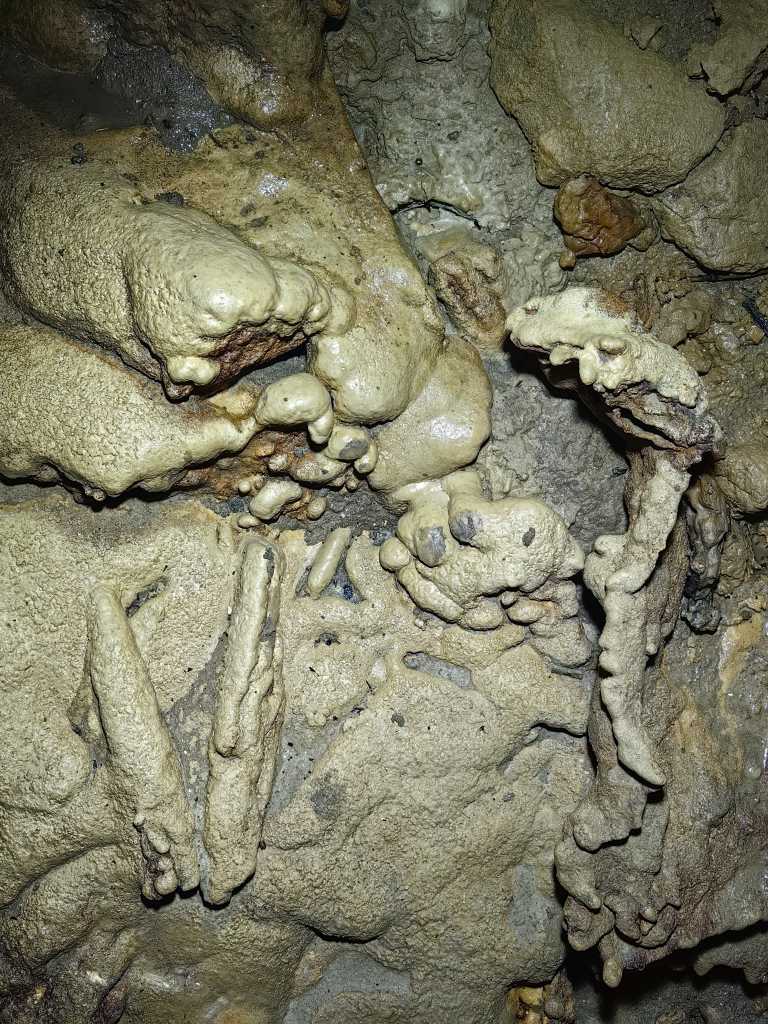 ВЛ69. На глиняном основании росла пара сталактит-сталагмит высотой около метра снизу доверху, но позже поток воды смыл значительную часть фундамента, и сталагмит оказался на балконе.