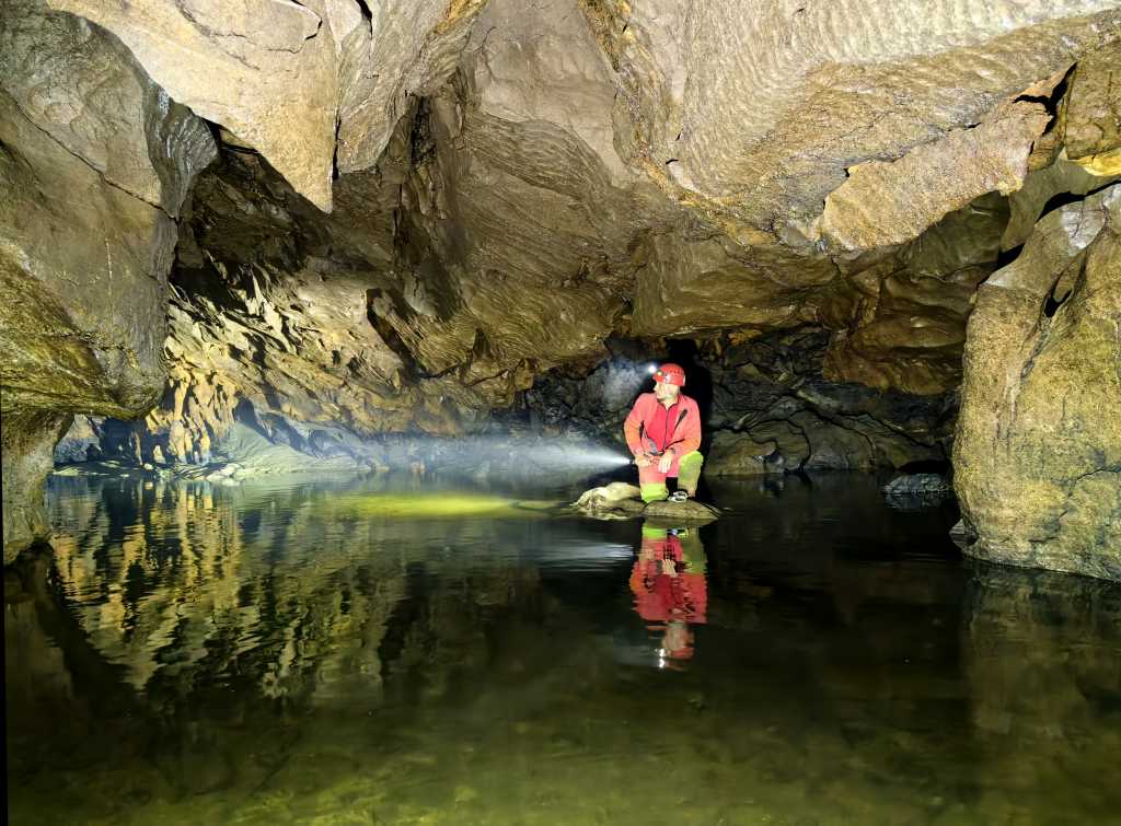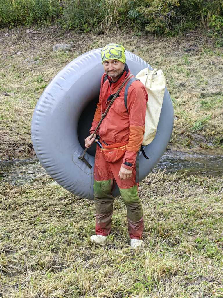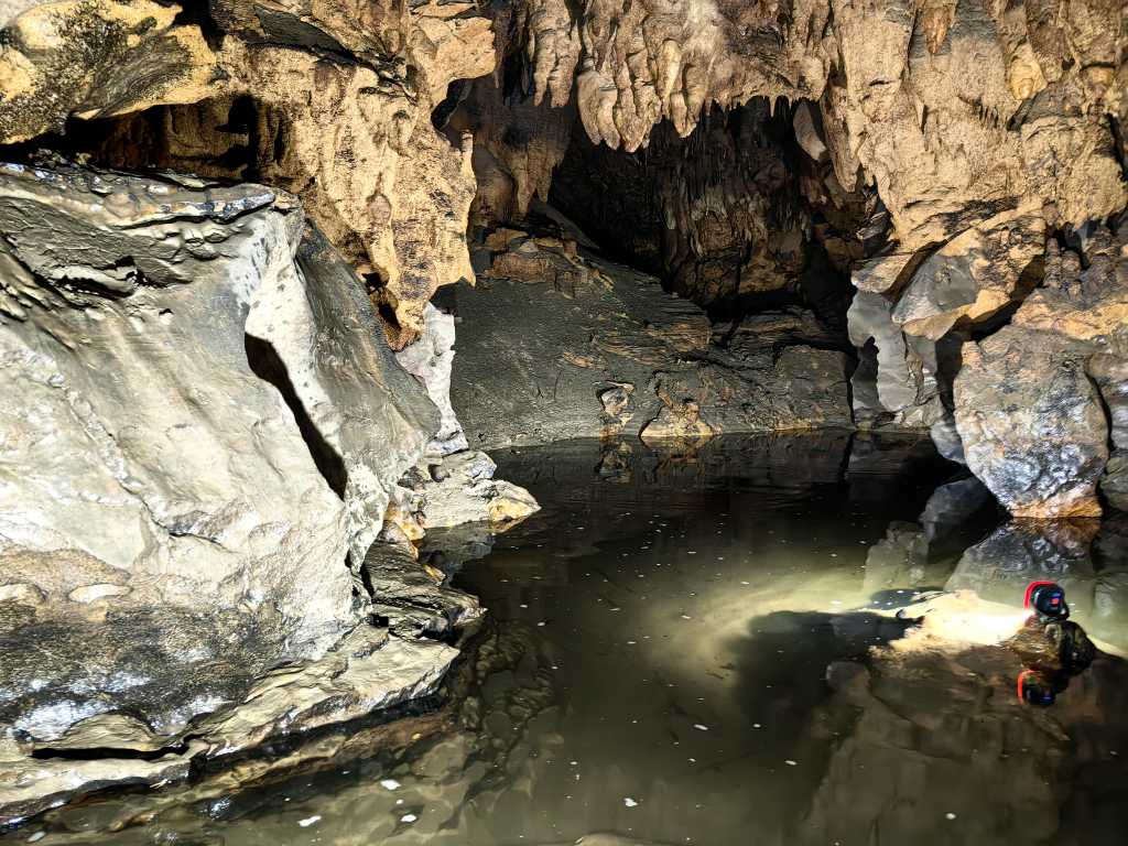 56176. Вскоре мы добрались до сифона. На обратном пути мы также заглянули в боковой канал, вход в который был достаточно широк, чтобы пропустить нашу лодку. В конце мы увидели просторный сухой тоннель, в который мы не смогли попасть, потому что проход мимо острой скалы, на которой стоит фонарик в красной рамке, был немного узковат. Автор был склонен отступить, но Владимир не сдался и решил подняться по склону слева на фотографии к сухому туннелю. Ему удалось довольно быстро подняться наверх и затем продолжить путь к тоннелю. Он скрылся в темноте, пока автор размышлял о том, насколько проблематичным будет спуск обратно к лодке. Но вскоре он понял, что лодка без Владимира имеет меньшую осадку, и что можно пройти мимо скалы к входу в сухой тоннель. Прошло около 15 минут, и он услышал голос Владимира, но не из сухого тоннеля, а сзади, из водного тоннеля, откуда мы мы пришли. Он нашёл обходной путь до водного тоннеля, и автор поплыл к нему. Опасный спуск к лодке не был необходим.