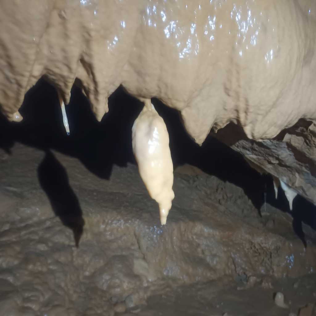 VL92. Speaking of unusual stalactite shapes - Vladimir found this strange stalactite when he and Miha delved deeper into the more hidden tunnels of the cave while the author, Sandi and Jana took their time in the Paradise Hall for some more elaborate photos and did not need the help of their more exploration oriented and, to be honest, much younger buddies. It looks as if the small stalactite ran out of steam to continue growing and decided to lengthen into a straw. However, the inflow of limestone-saturated water increased greatly and a stalactite shape resembling a long soup dumpling was created.