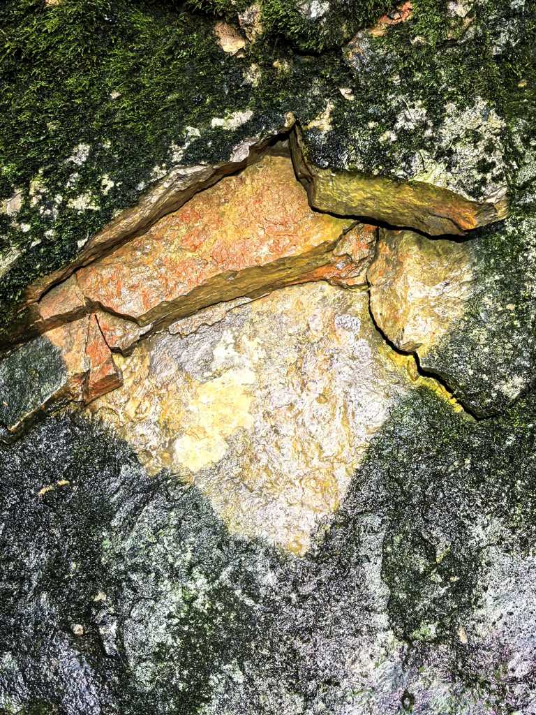 56700. A large stone that broke off from the supporting dry stone wall above the entrance knocked off the already slightly weathered slab of rock at its base and this colorful pentagonal fragment was created.