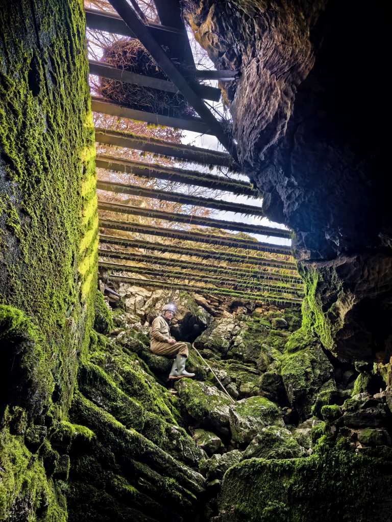 56787. Miha, the initiator of the excursion, just below the top of the entrance fissure of the cave, view from the surface