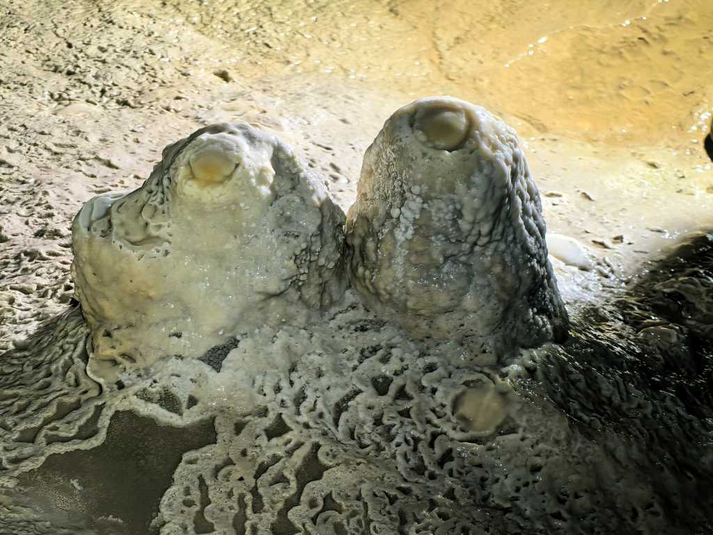 56724. Two small stalagmites in front of the wall, covered with dripstone balls.