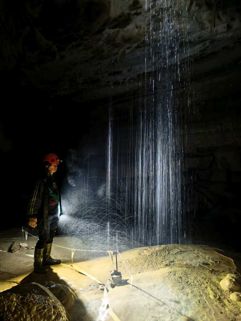56777. ... and, after a considerable descent, the water is dripping from the ceiling into a large, but very shallow lake from a great height. It has created an almost perfect pattern of concentric circles on the surface.