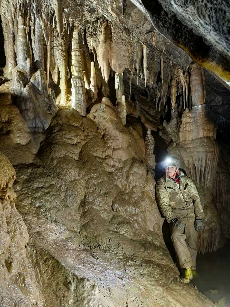 VL91. The column is remarkable and Sandi also decided to take a picture of it. Miha had already moved ahead, there was no other extra at hand, so the author volunteered — he has a slightly unusual stomach shape, because there are two small floodlights and a few other items in the caving suit above the waist. A little further ahead was Vladimir, who also didn't want to waste the time and decided to take this selfie with a story in the background.