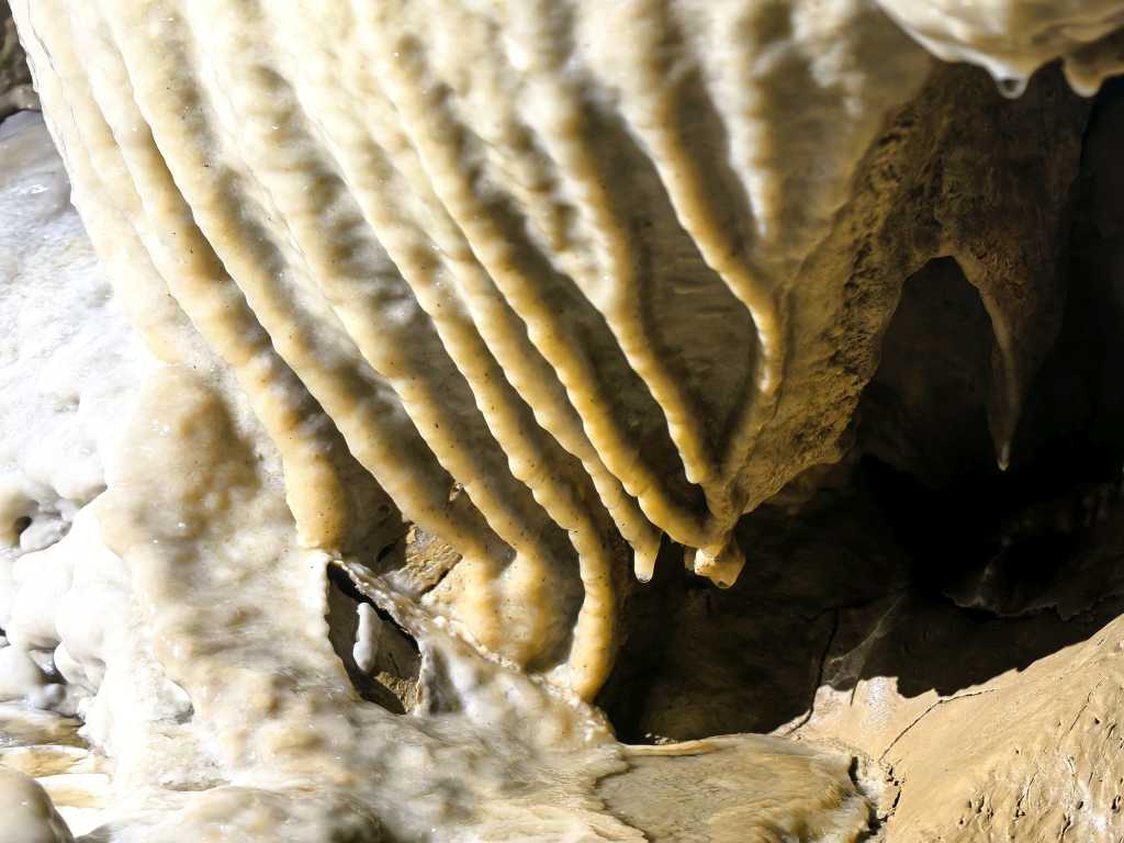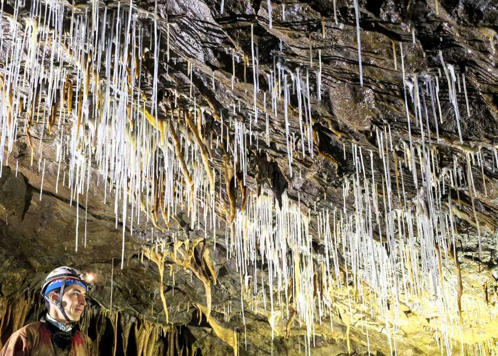 56768. The dripstone heap from the photo 56763 is complemented by a ceiling with cave straws. Miha was even more impressed than one might deduct from the photo.