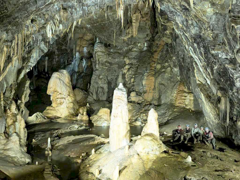 56783. In the left part of the previous photo, there are several beautiful dripstone heaps above the lake. Sandi (center right) helped with the lighting.