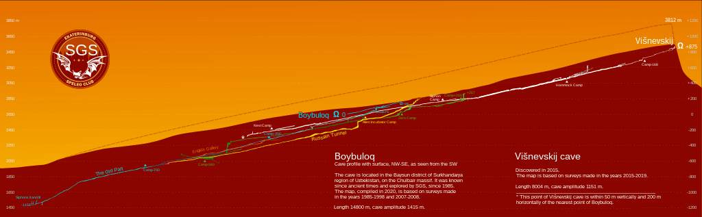 The above map shows the cross-section of the ridge with tunnels of both caves, as of 2019. It takes about three hours on foot to get from the entrance of Boybuloq, across the slope of Chulbair, to the entrance of Višnevskij. In the map the nearest point in Višnevskij (to Boybuloq) is marked with a white asterisk - click on the map to get the original on Wikimedia Commons where it can be enlarged.