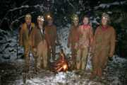 12. Počitek okoli ognja po ekskurziji: Matej, Stepo, Boni, Matija, Bina in Bojana, Lupertova jama, oktober 2003, 54 x 81 cm Najdena jama ima na severni strani precej močno nadaljevanje, dostopno le potapljačem preko sifona. Pri iskanju zimskih dihalnikov, ki bi peljali v ta novi del, je bila odkrita tudi Lupertova jama; ime je najbrž dobila po Lipertovi jami, ki jo iščemo že skoraj petdeset let. Avtor ni šel v jamo, ki zahteva precej kondicije za prodor skozi blatne navpične ožine, ampak je udeležence zvečer pričakal z ognjem na jasi pred jamo. Bina in Stepo sta prišla iz jame nekaj pred drugimi in sta se že precej posušila. |