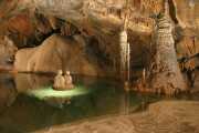 jama, Barbara in Marjeta, december 2003, 69 x 104.5 cm Strugi obeh potokov, ki se zlivata pri Kalvariji in struga Jezerskega potoka od tam do ponora nekaj sto metrov od vhoda v jamo so na mnogih mestih zelo lepo zasigane. Eno takih mest je tudi Beneški pristan v Devetem jezeru. Zaradi sigove kope, stalagmitov in kapniških stebrov, zelenine vode, ki jo privabi pravilno postavljena luč, ter bližnje sigove pregrade med Osmim in Devetim jezerom nudi stojišče, s katerega je bil napravljen posnetek enega lepših, čeprav ne najbolj klasičnih pogledov na ta biser podzemske lepote. |