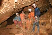 20. Matic, Luka in Klok v pasaži Matlukovega rova mačkovice, april 2004, 104.5 x 69 cm Na koncu Lažanskega ali Laškega rova v Mačkovici se ob začetku vzpona proti Veliki dvorani na desni strani odpira ozek rov, ki se zelo hitro spremeni v tesen navpičen prehod, v katerem je nastal posnetek. Ekskurzija je bila namenjena prodoru naprej in res se je prehod, s kar nekaj dela, pomaknil naprej za meter in pol. Nadaljevanje zapira skala, ujeta sredi položnejšega nadaljevanja levo zgoraj. Matic (njegova je noga z gojzarjem) je že v tem nadaljevanju, Klok, ki mu je bilo vroče in se je malo odpel, na vrhu navpičnega dela, Luka pa stoji pod njim. |