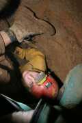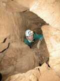 4. Matic, Luka in Klok v pasaži Matlukovega rova mačkovice, april 2004, 104.5 x 69 cm Na koncu Lažanskega ali Laškega rova v Mačkovici se ob začetku vzpona proti Veliki dvorani na desni strani odpira ozek rov, ki se zelo hitro spremeni v tesen navpičen prehod, v katerem je nastal posnetek. Ekskurzija je bila namenjena prodoru naprej in res se je prehod, s kar nekaj dela, pomaknil naprej za meter in pol. Nadaljevanje zapira skala, ujeta sredi položnejšega nadaljevanja levo zgoraj. Matic (njegova je noga z gojzarjem) je že v tem nadaljevanju, Klok, ki mu je bilo vroče in se je malo odpel, na vrhu navpičnega dela, Luka pa stoji pod njim. |