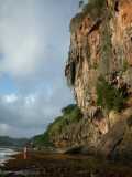 12. Rt Teutu z visečimi stalaktiti, ob oseki, pogled z juga, Nadja, februar 2003, 80 x 60 cm Rt Teutu je verjetno najslikovitejši izmed rtov otoka Rurutu, enega izmed Avstralskih otokov polinezijske skupine (več slik je na spletni strani http://www.jakopin.net/primoz/slike/rurutu_2003). Je malo pod sredino zahodne obale otoka, južno od vasi Avera. Na rtu je koralni greben zelo ozek in okoli rta je mogoče priti le ob oseki, pa še takrat ne brez tveganja zaradi občasnih velikih valov. Je nekaj manjših jam, najbolj impozantni pa so ostanki stropa dvorane, katere večji del je že odplaknilo morje, ki se pnejo pod robom klifa. |