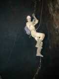 3. Tomaž na lestvicah pod Baldahinom, Najdena jama, maj 2003, 80 x 60 cm Najdena jama je ena najbolj eksotičnih jam pri nas, poleg velikih temnih sten in vse tiste ilovice, ki je je na površju nad njo dosti manj, skriva tudi veliko lepih detajlov. Na veteranski ekskurziji Društva za raziskovanje jam Ljubljana, ki je vsako leto zadnjo soboto v maju, letos že petindvajsetič, je priložnost, da jo obiščejo tudi vsi tisti, ki se z jamarstvom sicer redno ne ukvarjajo. Prva prepreka je spust preko Baldahina, poleg vrvne tehnike navadno možen tudi še na klasičen način, z lestvicami. Tomaž je pri povratku iz jame ohranil še toliko svežih moči, da se je na lestvice odpravil v "švungu" in z navdušenjem; šlo mu je, da ga je bilo veselje gledati. |