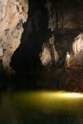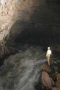 Luka, april 2004, 104.5 x 69 cm Edino sotočje dveh podzemskih rek pri nas, Pivke in Raka, je v Planinski jami in slap reke Rak, ki ob srednji in visoki vodi pada preko 4 m visoke stopnje, je eden najveličastnejših prizorov v jami. Zaradi velikosti ga je težko dobro osvetliti, dodatna težava je pa še vlaga v zraku, ki megli sliko. Posnetek je bil narejen že iz bližine slapu, malo naprej od konca žične prečke, ki pelje s ploščadi nad sotočjem. |